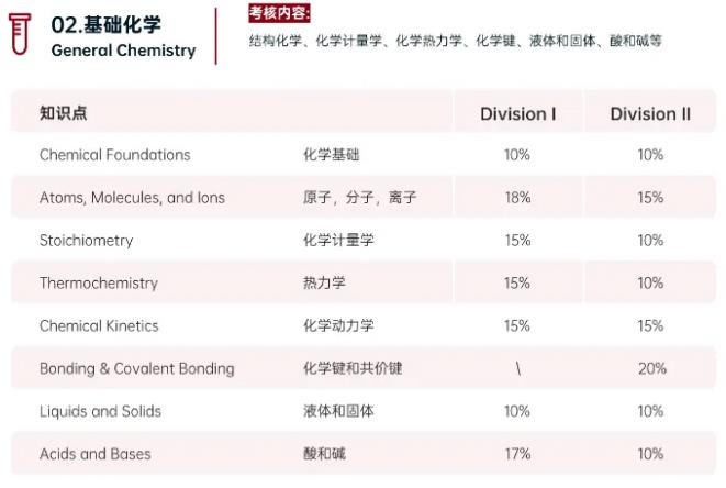 Division l 10%;Division ll 10%;原子,分子,离子:Division l 20%;Division ll 15%;化学计量学:Division l 15%;Division ll 10%;热力学:Division l 15%;Division ll 10%;化学键和共价键:Division l 15%;Division ll 15%;液体和固体:Division l 10%;Division ll 10%;化学动力学:Division l 15%;Division ll 15%;化学平衡:Division ll 15%。