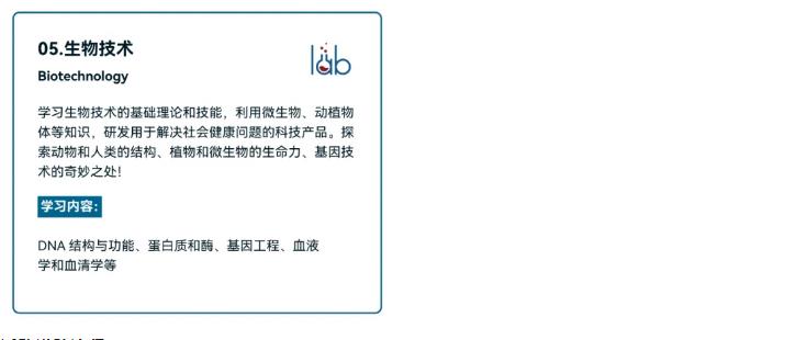 CCE挑战强调拓展更加专业的学术知识,不同于ATC挑战与校内知识兼容,CCE注重与大学预选课程的衔接,帮助在生物、医学、健康、化学领域有专业意向的同学提前了解相关学科知识,深度挖掘专业兴趣,拓宽知识储备,为大学课业提前打好基础!挑战分设5个具体项目: